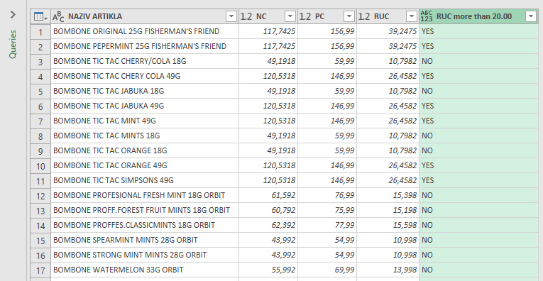 The Power Query Editor imported a table of item names, purchase price (NC), sales price (PC), and price difference (RUC). How to check if the price difference is more than 20.00 RSD? In the Add Column ribbon, select the Conditional Column option. This will open a dialog where you must first enter the name of the new column that will be created as a result of this operation. Then we enter the name of the column we compare, further the condition, and then the value to compare it with. In the Output field, enter the result that will appear in the row where the conditions are met. In the Otherwise field, enter an optional result that will appear if the condition is not met.