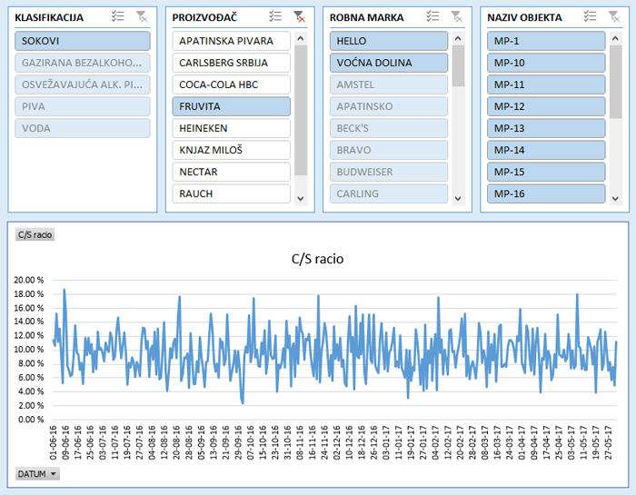 Further we will create a PowerPivot chart in which we follow the C/S ratio in relation to the dimension DATUM (DATE) on the x axis, and we will also add a few slicers: PROIZVOĐAČ (MANUFACTURER), ROBNA MARKA (BRAND), KLASIFIKACIJA (CLASSIFICATION), and OBJEKAT (OBJECT). If we narrow down the display of data, for example by choosing the manufacturer “FRUVITA” in slicer PROIZVOĐAČ (MANUFACTURER), we will see how the C/S ratio is being changed and our report will display data only for chosen manufacturer.