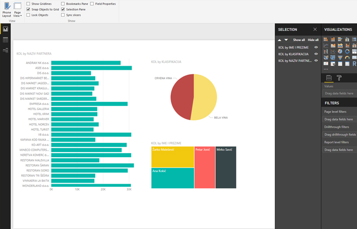 View ribbon has several options to manage the report view. By marking the Selection Pane checkbox action will display selection panel. It provides an overview of all reporting objects, and by clicking on an icon that resembles an eye, to the right of the visual name, can choose to hide it or re-display it. Also, when selecting multiple objects, we can perform alignment in the report. The Lock Objects option allows you to lock the selected visuals, after which can no longer move them. Bookmarks Pane opens a special panel where we can save your favorite report layout, similar to when we add favorites to the Internet browser. Field Properties allows you to display dimensional properties as a tooltip, and Sync Slicers opens a panel in which we choose whether the slicer is synchronized with its „twins“ located on other pages of the report.