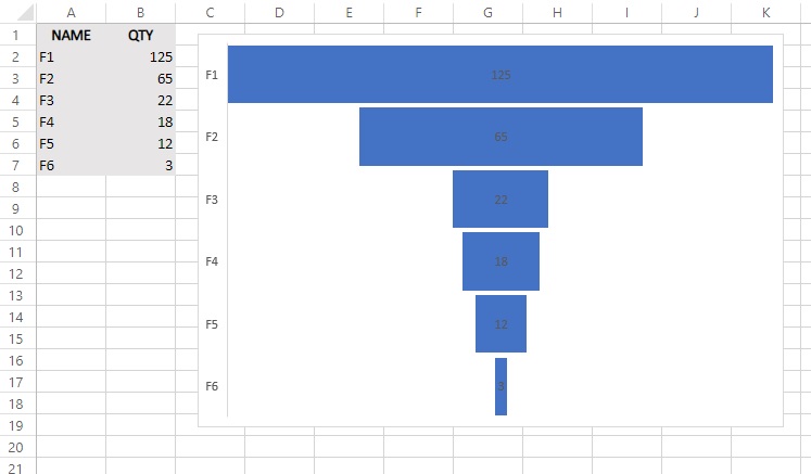 Let’s create a table in which we’ll follow phases of the sale of some business software, as well as the number of clients in through phases. In the first column, the phases will be marked: F1 (entrance in database), F2 (initial contact), F3 (meeting), F4 (presentation), F5 (offer), F6 (contract). In the second column we add the number of clients through phases. If we select a table and go to the Insert ribbon, we can find the option to add a Funnel chart. By performing such action a chart will be shown in which each bar is broadly proportional to the number of clients in the given phase, and from the top to the bottom we see their position, through stages, in the sales funnel.