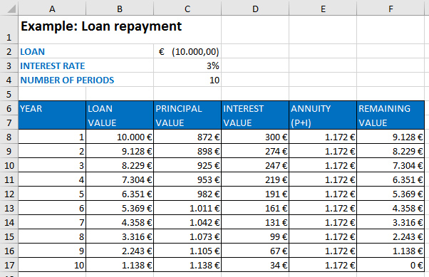 which is the value of the loan less the repaid principal. We see the remaining value in the column REMAINING VALUE. Here we use the same formula as in column B.