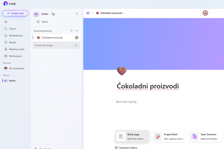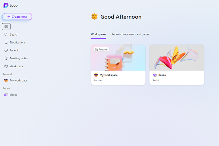 The easiest way to access the app is via the link: https://loop.cloud.microsoft. It takes you to the front page where you can see the Loop Workspaces. These are shared spaces where team members keep everything important for the implementation of the project. By clicking on the Create New button, you can create a new workspace, and double-clicking on an existing one will open that workspace.