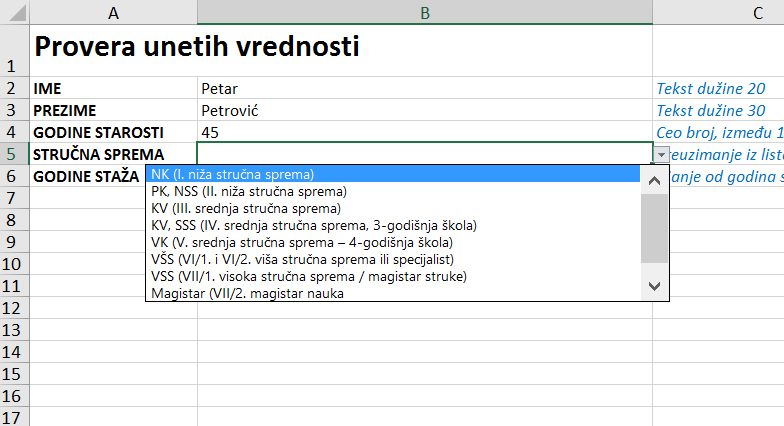 When you use the Data Validation option, names of the elements in the list have system-defined font size and this cannot be changed. If you need larger labels there is a trick on how to achieve this. First, reduce the font size in the worksheet. It is best to select all values (CTRL + A), and then go to the Home ribbon and click on the icon to reduce the font until you reach e.g. up to 80% impairment. Then zoom in content of the screen by 20%. Finally, you re-enlarge the fonts that you previously reduced to the desired size. If you try to open the drop-down list, you will see that its elements are larger.