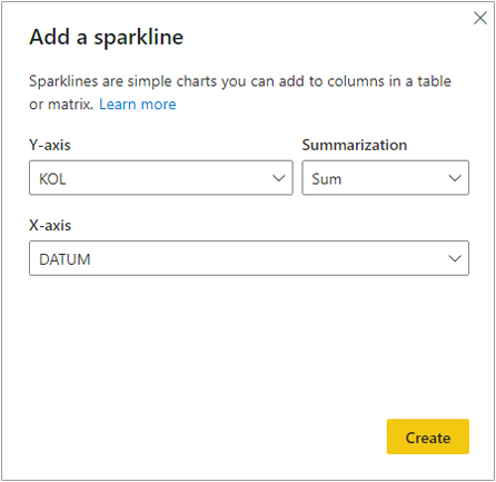 A window will appear in which we enter the settings for creating this chart. The Y-Axis field serves to add the value we want to analyze. It can be quantity, amount, difference in price, etc. In this example we will choose the dimension KOL (quantity). Then in the Summarization field we select the type of aggregation. There are several functions which are offered here. We will select the SUM function. Finally, in the X-Axis field, we choose the dimension on the basis of which we perform the analysis, which is usually a date field. In this example we add the DATUM (date) dimension. By clicking the CREATE button we’ll complete the creation of the sparkline chart.