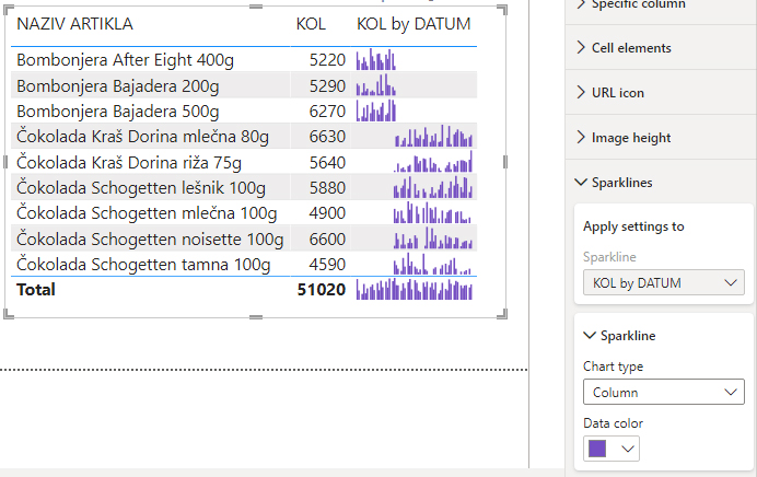 Sparkline is a chart that is located inside the cell and shows the change in value over a given period of time, and is suitable for observing trends. It can be a Column or Line chart. This way of presenting data has been in Excel since version 2010, and has recently become available within the Power BI Desktop reporting platform. In the text that follows, you will find out how it is added and changed …