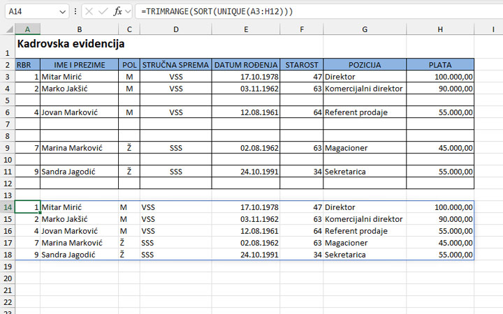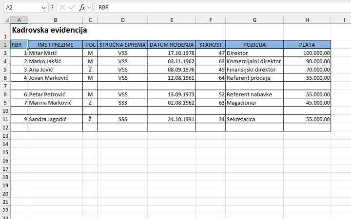 Let’s start with a simple table on which the data of the employees is recorded. In the table, by random selection, a few rows were deleted. How do you remove them so that they are no longer visible, that is, extract only those rows which have data from the table?