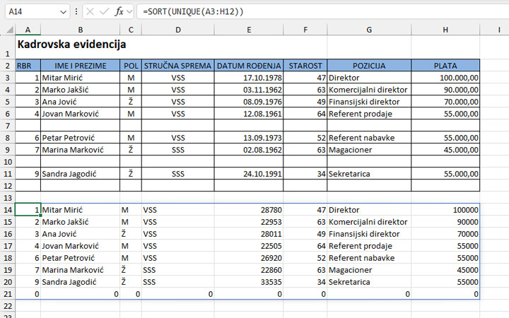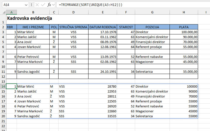 If we try to remove another row, the table will be updated automatically. Finally, to get the dates and salary values shown in a correct way, it is necessary to use appropriate formatting for the proper columns in the area where the new table will be placed.