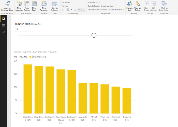First we’ll add a visual to the report that we’ll filter later. Let it be a turnover in quantities in relation to the name of the article. Then we will click on the New Parameter button, after which a window will appear where we enter the name of the new parameter, the data type, the start and end value, the default value and the increment. By clicking OK, we confirm the creation of a parameter and the addition of a slider.