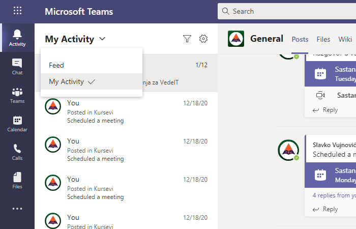U meni ulazite klikom na ikonicu koja se nalazi u Teams meniju, sa leve strane prozora. Neposredno pored nje se nalazi padajuća lista sa dve opcije: Feed i My Activity. U prvoj možete da vidite sve objave, u timovima i kanalima čiji ste član, dok se u drugoj vide samo vaše aktivnosti.