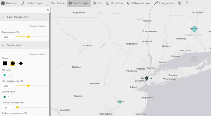 Dodatnim podešavanjima mape pristupamo nakon prikaza kontekstnog menija, koji otvaramo klikom na ikonicu označenu sa „…“, gde dalje treba odabrati opciju Edit. Nakon ove akcije prikazaće se uvećana mapa na kojoj se, sa gornje strane, nalazi meni sa više opcija. Basemap i Map Theme su opcije pomoću kojih podešavamo način prikaza mape. Location Type sadrži opcije pomoću kojih možemo da preciziramo gde se nalaze geografski objekti koje posmatramo, a Symbol Style sadrži opcije za detaljno formatiranje objekata prikazanih na mapi. Opcija Pins može se iskoristiti za pretraživanje mape, a Drive time potrebno vreme za putovanje između dve označene lokacije.