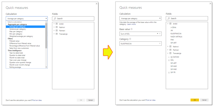 Kada aktivirate opciju New Quick Measure otvoriće se prozor u kome najpre treba izabrati vrstu agregacije podataka. Zatim, u zavisnosti od izabrane opcije, biće prikazana polja u koja treba prevući željene izveštajne dimenzije. Prevlačenjem dimenzija u polja mi dajemo instrukcije aplikaciji kako da kreira DAX izraz, što se automatski izvršava nakon završetka unosa i potvrđivanja.
