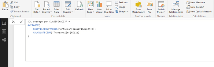 U Home ribonu se nalaze opcije za dodavanje mera (New Measure) i izračunatih kolona (New Column), a od skoro i nova funcionalnost koja se koristi za dodavanje „brzih mera“ (New Quick Measure). Ona omogućava početnicima, koji nemaju iskustva u pisanju DAX izraza, da kreiraju mere prostim prevlačenjem naziva izveštajnih dimenzija u predviđena polja, nakon čega aplikacija automatski vrši generisanje formula.