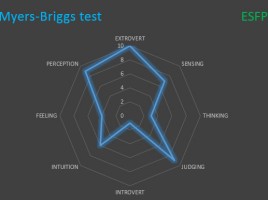 Myers–Briggs test ste verovatno već sreli na nekom od razgovora za posao, prilikom popunjavanja one ankete gde se čini da se pitanja ponavljaju. U pitanju je indikator tipa ličnosti, na osnovu koga se ispitanik klasifikuje pomoću četiri tipa i dva podtipa: ekstorvertan-introvertan, doživljajan-intuitivan, misleći-osećajući, prosuđujući-perceptivan. Idealno sredstvo za prikaz rezultata ovog testa je Radar grafikon.