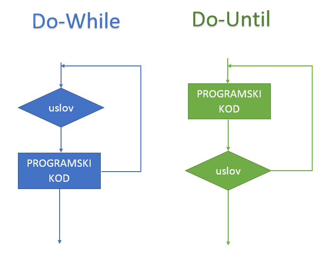 Kao što vidite u ovoj petlji se uslov proverava odmah na početku, a ako je zadovoljen izvršava se zadati kod; ako nije, petlja se napušta. Ukoliko postoji potreba da se uslov proverava na kraju potrebno je iskoristiti Do-Until petlju koja ima istu sintaksu, ali drugačije proverava ispunjenost uslova. Ako modifikujemo prethodni kod dobićemo: