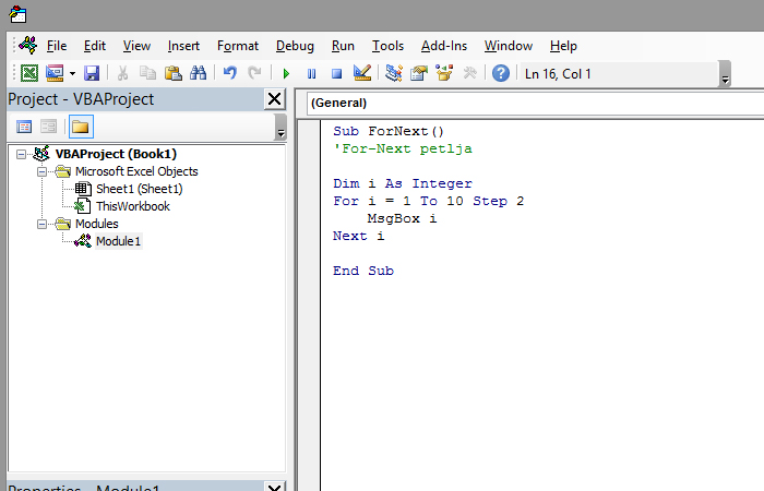 Petlje su strukture koje se koriste ukoliko želimo da više puta ponovimo zadati programski kod. Najjednostavnija za razumevanje i verovatno najčešće korišćena je For-Next petlja. Ona se koristi kada tačno znamo koliko puta želimo da ponovimo određenu akciju. Najpre se zadaje početna, a zatim krajnja vrednost i opciono vrednost za koju se vrši uvećavanje brojača. Zatim unosimo deo koda koji se ponavlja, a na kraju iza naredbe Next navodimo naziv brojača.