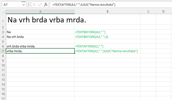 Najjedostavniji način upotrebe ove funkcije je da zadate tekst i delimiter- znak koji se koristi za razdvajanje. Ako zadamo rečenicu „Na vrh brda vrba mrda.“ te napišemo formulu: