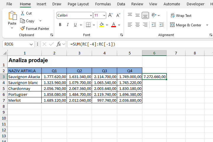 Kako sabrati ukupnu vrednost prodaje vina Sauvignon Akacija za sva četiri kvartala? Uobičajeni način bio bi upotrebom formule: