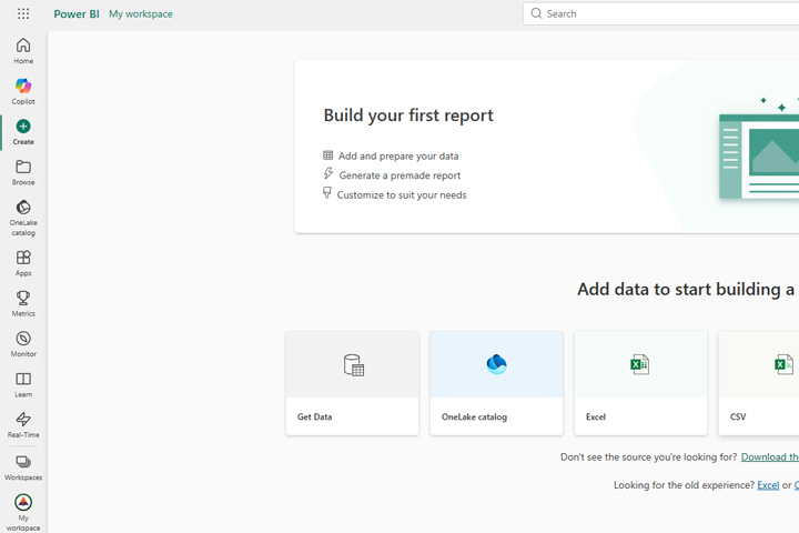 Kako se ovo koristi? Prijavite se u Microsoft Fabric. Nakon prikaza početnog menija kliknite na dugme Create, a zatim na Get Data kako biste uvezli podatke. U ovom primeru uvešćemo podatke iz Excel datoteke gde se nalaze dve tabele: Artikli i Transakcije.