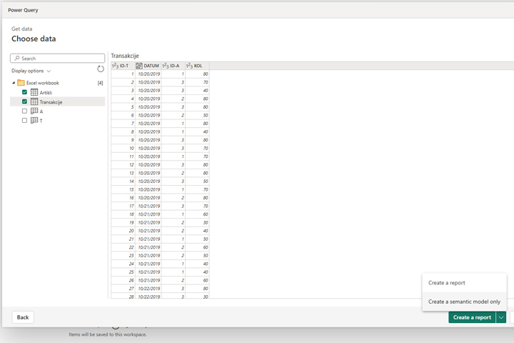 Prilikom uvoza podataka Microsoft Fabric će pokrenuti Power Query. U prozoru ćete videti tabele koje je on prepoznao, kao i pregled sadržaja onih koje označite. Potrebno je selektovati tabele Artikli i Transakcije. Dalje, nećemo ulaziti u Power Query Editor klikom na dugme Transform, a takođe nećemo ni automatski krenuti u izradu izveštaja klikom na Create a report. Izaberite opciju Create Semantic Model only. Izaberite naziv modela po sopstvenom nahođenju.
