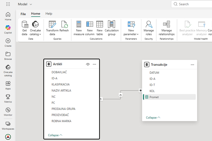 Nakon što ste kreirali semantički model automatski će se otvoriti Model View u kome su prikazane uvezene tabele. Ovde možete kreirati relacije između njih, npr. povezati Artikle i Transakcije, ali takođe možete da radite i sve ono što biste inače radili koristeći Power BI Desktop. Možete da pravite hijerarhije izveštajnih dimenzija, da menjate tip podataka i format kolona, ime, da kreirate sinonime, mere, izračunate kolone itd.