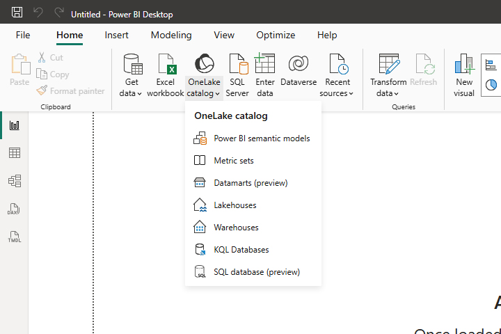 Otvorite Power BI Desktop. Važno je znati: on mora da bude povezan sa vašim tenantom da biste imali pristup podacima koji se na njemu nalaze. Kreirajte prazan izveštaj. Zatim započnite sa uvozom podataka, otvorite OneLake catalog, pa izaberite Lakehouses…