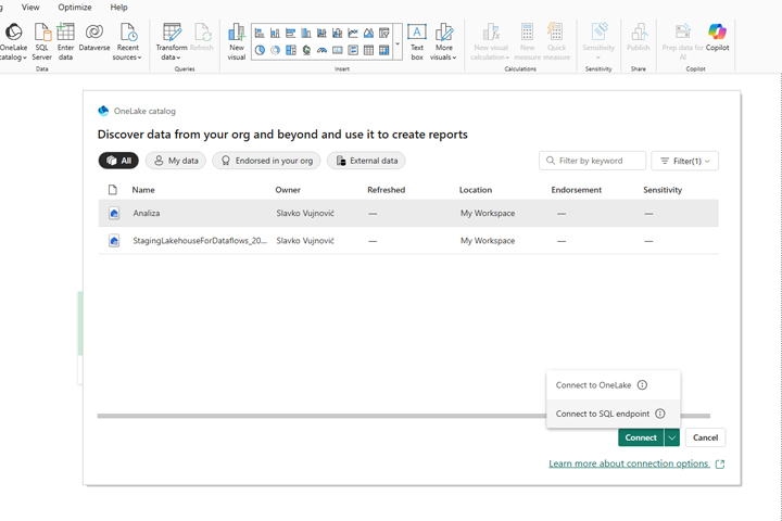Izaberite Lakehouse koji se zove Analiza. Prilikom povezivanja umesto opcije Connect izaberite Connect to SQL Endpoint. Na ovaj način moći ćete lako da izvučete podatke potrebne za izveštavanje.