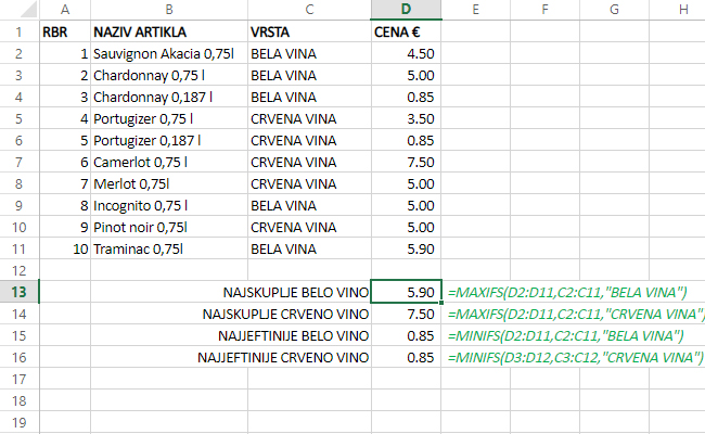 Kao rezultat, dobićemo vrednost najskupljeg belog vina. Da smo iskoristili funkciju MINIFS dobili bi smo vrednost najjeftinijeg.