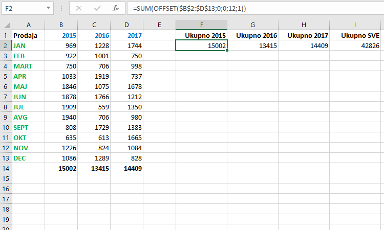 U zavisnosti od godine promenili bi smo parametre koji ukazuju na to koja kolona se sabira. Funkcija OFFSET omogućava i sumiranje više kolona pa ako želimo da izračunamo promet za sve tri godine napisaćemo formulu: