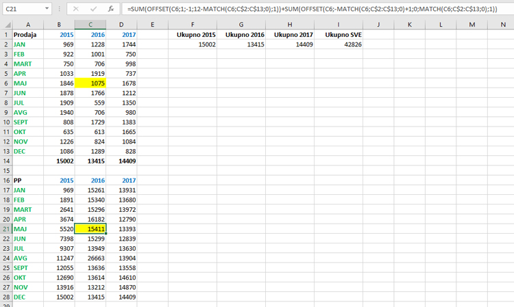 Sada je samo još potrebno da u delovima iskaza gde se koristi MATCH funkcija uklonimo znak dolara ispred kolone C, gde se navodi kolona koja se pretražuje. Ovo je učinjeno da bi se formula automatski ažurirala prilikom kopiranja. Za kraj, iskopirajmo formulu u preostale ćelije osim u poslednja tri reda. Ovde trena iskopirati formule koje izračunavaju sumu za celu godinu. Ova formula radi i za prvu kolonu, pod pretpostavkom da nema prometa u prethodnim godinama.