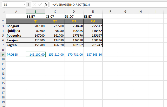 za vrednosti prodaje u koloni B. Kopiranjem formule računamo proseke i za preostale kolone. Funkcija INDIRECT iz zadate ćelije preuzima tekst koji konvertuje u opseg, a opseg se dalje prosleđuje funkciji.