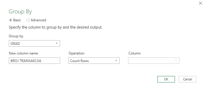 U Power Query Editor ćemo da uvezemo jednostavnu tabelu sa 2000 redova koja poseduje tri kolone: GRAD, PRODAJNA GRUPA i PRODAJA. Za grupisanje treba izabrati opciju Group By koje se nalazi u Transform ribonu. Nakon što pokrenemo ovu opciju otvoriće se istoimeni dijalog prozor u kome najpre biramo vrednost Basic ili Advanced. Prva označava da vršimo operacije nad samo jednom kolonom, a druga da želimo da grupišemo više kolona. Da smo, pre pokretanja opcije, selektovali više kolona automatski bi se otvorio prozor sa aktiviranom opcijom Advanced.