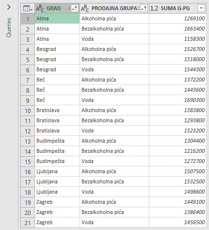 Nakon što potvrdimo izbor dobićemo tabelu sa vrednostima sumiranim po gradovima i prodajnim grupama. Na kraju je još samo potrebno da sortiramo vrednosti po nazivu grada i prodajne grupe kako bismo dobili lepši izveštaj.
