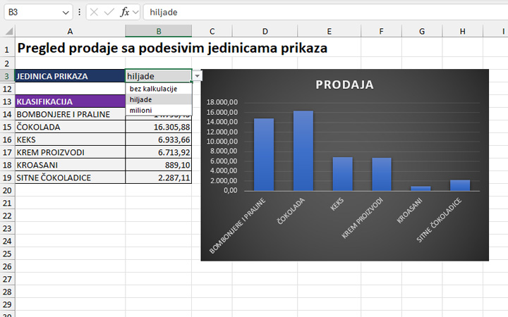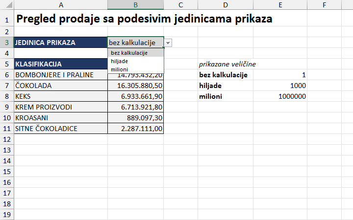 Krećemo sa jednostavnom tabelom koja prikazuje pregled prodaje u odnosu na klasifikaciju. Iznad nje smo dodali padajuću listu iz koje biramo jedinicu prikaza vrednosti. Jedinice prikaza biraju se na osnovu opsega sa njihovim nazivima u pomoćnoj tabeli.