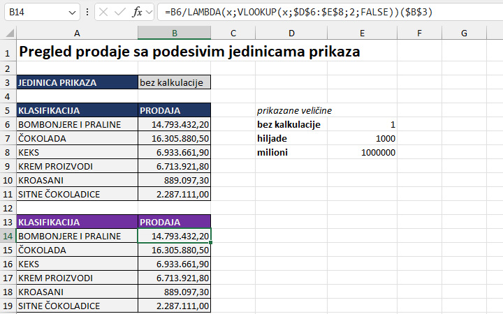 Kada kreiramo neki izveštaj prodaje ponekad želimo da prikažemo vrednosti u njihovom izvornom obliku, a nekada to mogu da budu preračunate vrednosti, npr. hiljade ili milioni. Ovakav izveštaj se kreira na jako jednostavan način upotrebom opcije Data Validation,koja omogućava izbor željene veličine, i uz pomoć Excel funkcije LAMBDA. Napravimo jedan ovakav izveštaj sa grafikonom, radi vizualizacije podataka.