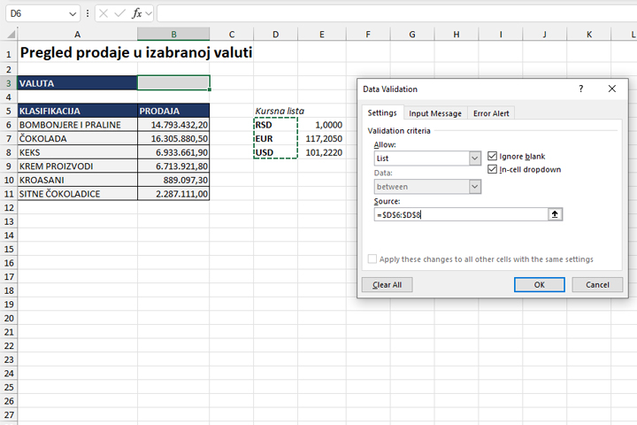 Desno od tabele u kojoj vidimo vrednosti prodaje u odnosu na klasifikaciju dodali smo tabelu koja prikazuje kursnu listu za RSD, EUR i USD. U praksi, nju ćete kreirati u drugom radnom listu, a ovde je prikazana kako biste lakše shvatili mehanizam rada funkcije LAMBDA. U ćeliji B3, uz pomoć opcije Data Validation, podesili smo da se vrednosti valute biraju iz liste.