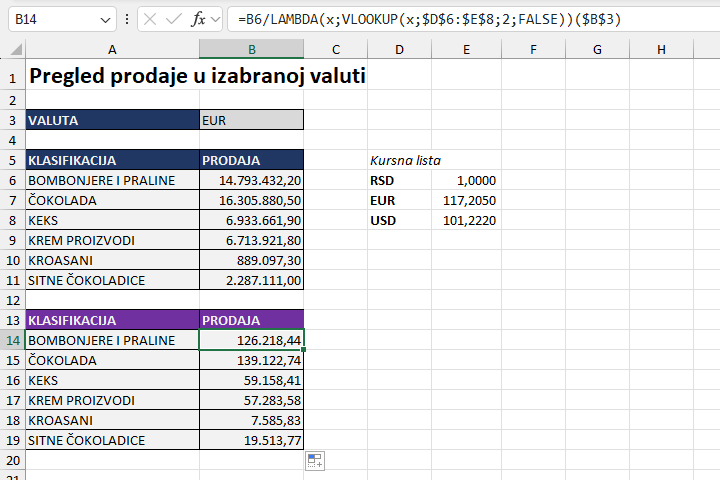 Funkcija LAMBDA ima dva argumenta: promenljivu x i izraz gde se ona koristi. U izrazu smo iskoristili funkciju VLOOKUP koja, na osnovu x (zadate valute) pronalazi vrednost valute u tabeli, a zatim vraća drugu kolonu- kurs. Na kraju formule, u zagradama, naveli smo da se x preuzima iz ćelije $B$3. U praksi ovo znači da vrednost prodaje delimo sa kursem, a koji će se kurs iskoristiti zavisi od toga šta smo izabrali u ćeliji B3.