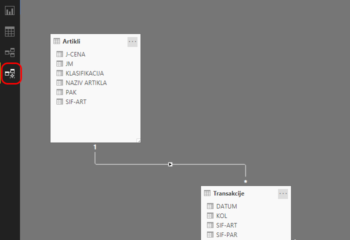 Novi izgled Relationship view-a je još uvek u razvojnoj fazi pa je potrebno najpre uključiti njegov prikaz, što radimo iz Options dijaloga Power BI Desktop aplikacije. Nakon što to uradimo, pa ponovo pokrenemo program, sa leve strane će se pojaviti ikonica koja izgleda isto kao ona koja predstavlja tradicionalni pogled na model podataka, s tim što ima „zvezdicu“ i označava noviju verziju pogleda na tabele i veze.