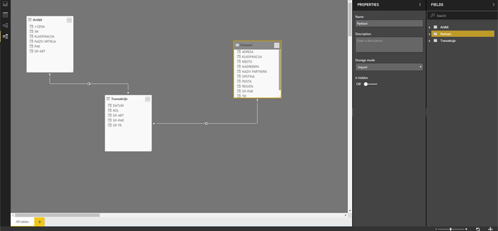 U centralnom delu ekrana vidimo tabele čiji je izgled malo izmenjen u odnosu na ono što smo ranije sretali. Glavna novost je što sa desne strane postoje dva nova panela: Fields i Properties. U panelu Fields možemo da vidimo sve tabele koje se nalaze u modelu, kao i kolone (polja) koja u njima postoje. U slučaju da imamo model koji je sastavljen od velikog broja tabela on nam olakšava navigaciju ka željenoj tabeli/koloni.