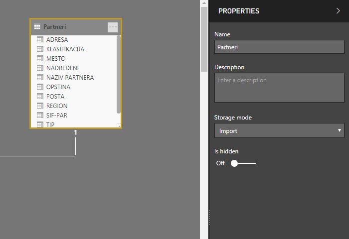Ako izaberemo neku tabelu panel Properties prikazuje njeno ime i opis, koje možemo da promenimo ukoliko to želimo. Takođe, u ponudi su i opcija za sakrivanje u modelu, kao i opcija Storage mode pomoću koje biramo na koji način se preuzimaju podaci. Otvaranjem menija ona će ponuditi tri načina povezivanja: Import, Direct Query i Dual. Podrazumevana vrednost je Import i ona označava da, prilikom povezivanja sa izvorom podataka, vršimo uvoz podataka u model. Direct Query se koristi kada se direktno povezujemo sa izvorom podataka, a Dual je kombinacija dva prethodna moda.