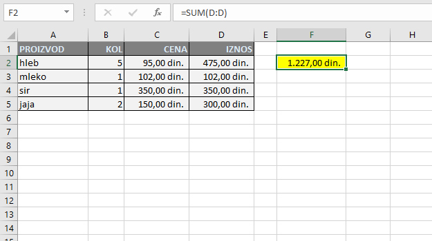 Pod uslovom da se ćelija gde smo uneli formula ne nalazi u koloni D ovo će raditi savršeno, jer smo „kazali“ funkciji SUM da sabere sve vrednosti koje se nalaze u koloni D.