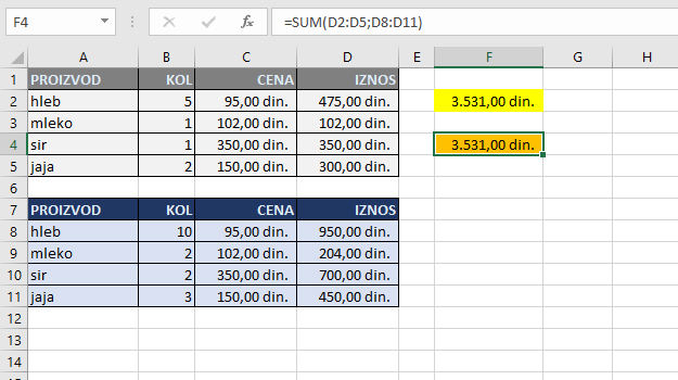 Rezultat je isti. U ovoj formuli funkcija SUM ima dva argumenta, zadata kao dva opsega. Možemo da joj zadamo do 255 argumenata i, pod uslovom da smo uneli ispravne argumente, ona će uvek da izračuna njihov zbir.