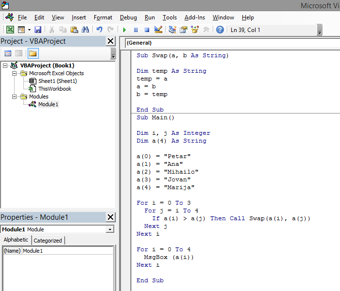 Kreirali smo proceduru Swap, koja menja mesta zadatim argumentima, a zatim je iskoristili u Bubble Sort algoritmu: