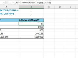 Kada evidentirate decimalne brojeve, u zavisnosti od regionalnih podešavanja, koristićete decimalni zarez ili tačku. To se, u većini slučajeva, jedanput podesi (Region settings) i ovom temom se više ne bavimo. Međutim, može se dogoditi u praksi da uvozite podatke, najčešće iz CSS datoteke, gde se koriste drugačiji znakovi za razdvajanje decimala i grupa nego što su vaša lokalna podešavanja. U tom slučaju iskoristite funkciju NUMBERVALUE…
