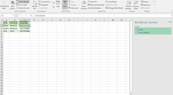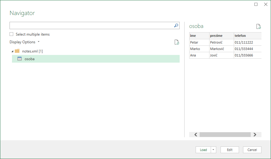 Zatim izabrati željenu XML datoteku. Otvoriće se prozor za uvoz u kome treba izabrati entitet na osnovu koga se vrši grupisanje podataka. U našem primeru, to je „osoba“. Power Query će automatski generisati pretpregled sa desne strane prozora. Klikom na Load vrši se uvoz podataka u strukturiranu tabelu.