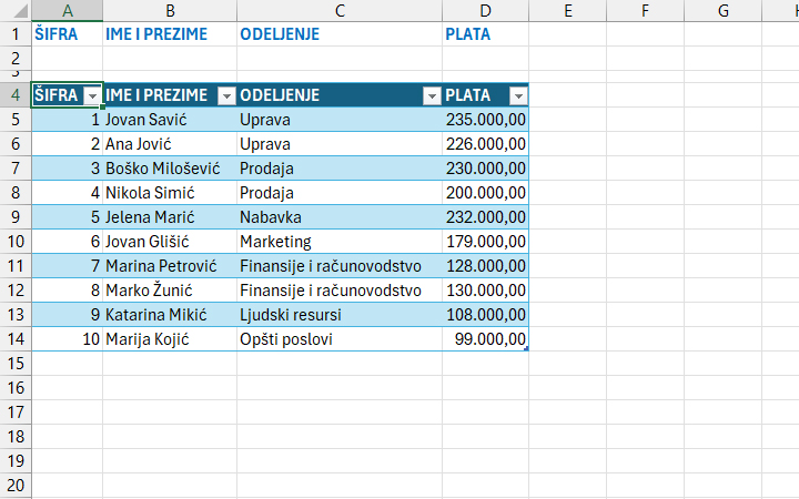Krenimo od jedne jednostavne tabele u kojoj su prikazani šifra, ime i prezime, odeljenje i plata zaposlenih u jednoj kompaniji.