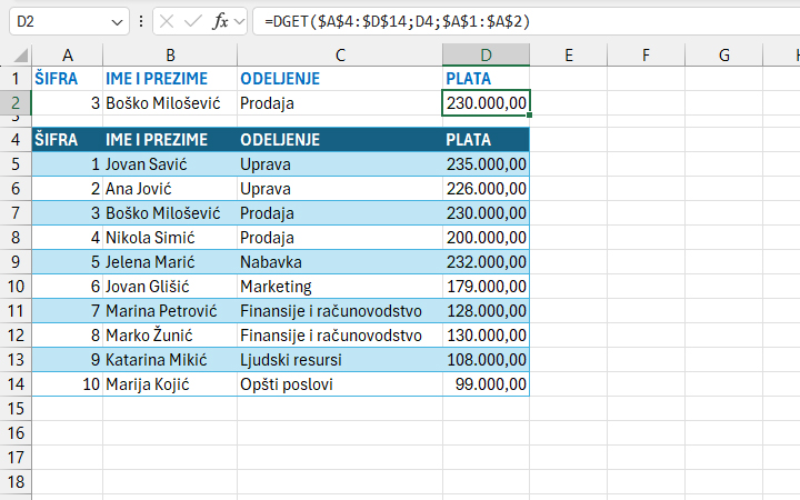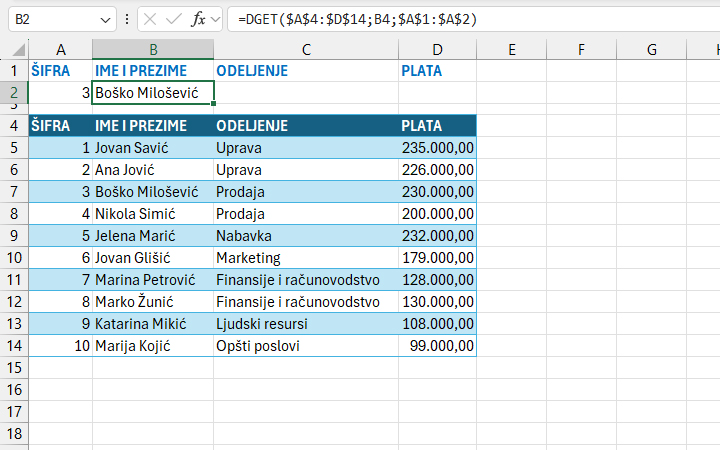 Pretragu započinjemo tako što ćemo u ćeliji A2 uneti šifru na osnovu koje pretražujemo podatke. Neka to bude broj 3. Zatim u B2 unosimo formulu za pretraživanje imena i prezimena: