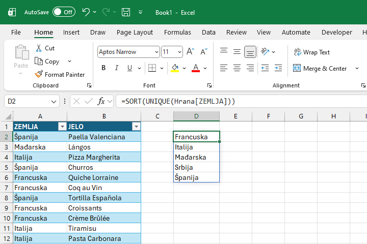 =SORT(UNIQUE(Hrana[ZEMLJA]))