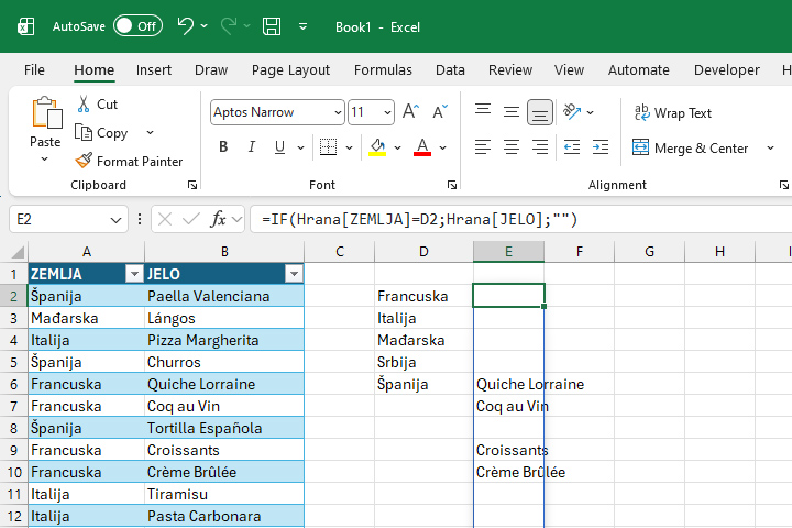 Sada je još samo potrebno prekopirati formulu u preostale ćelije. Kao rezultat dobićemo višestruke rezultate pretrage tj. sva jela koja pripadaju određenoj zemlji, čiji naziv koristimo kao kriterijum pretrage.