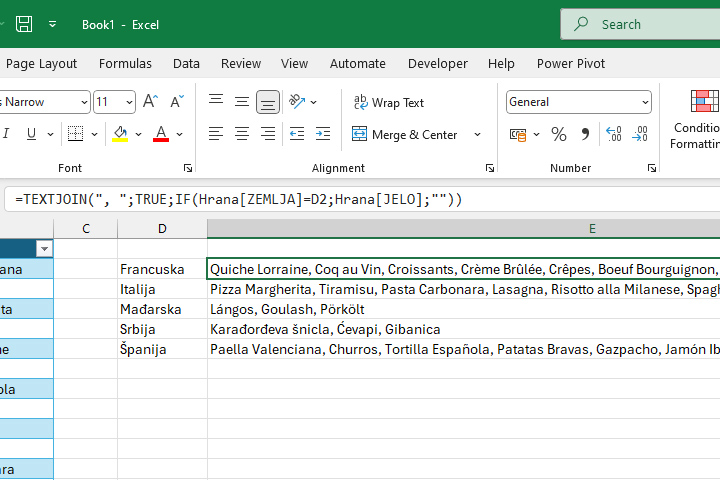 =TEXTJOIN(„, „;TRUE;IF(Hrana[ZEMLJA]=D2;Hrana[JELO];““))