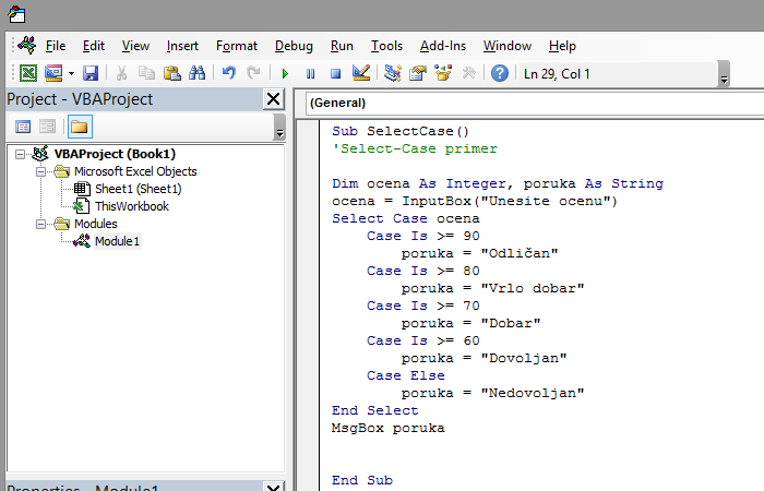 Kao što vidite Select-Case struktura je puno pogodnija od ugnježdene If-Then strukture ako imamo veći broj mogućih ishoda.